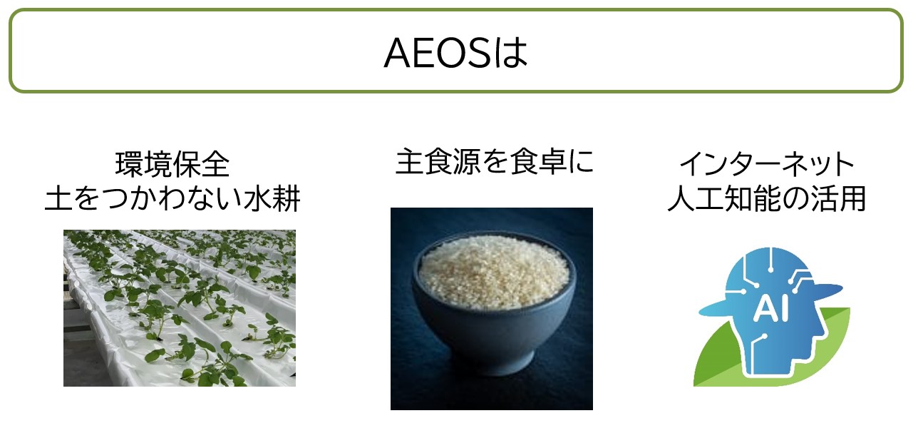 AEOSは、土壌を使用せず少ない水利用の水耕栽培に、最新の水耕技術、IoTとAIを活用した農業のエコシステム確立して、食糧の生産を目指しています。