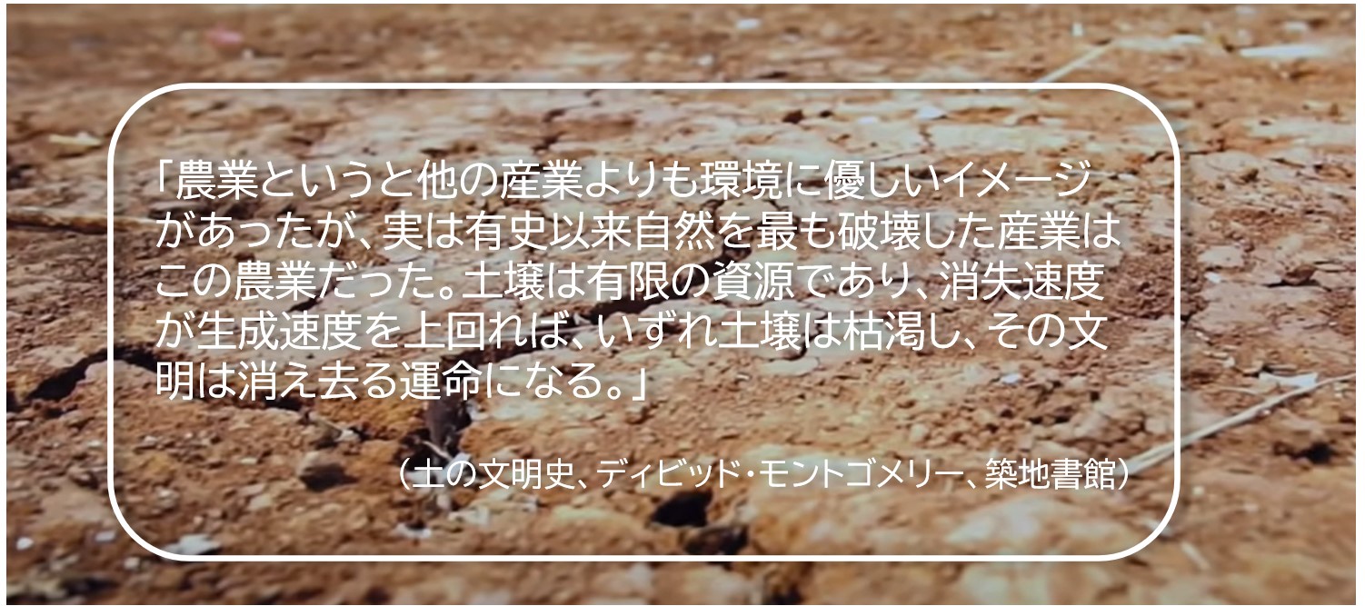 しかし現代の慣行農業は土壌退行が進み気候変動を助長していると言われ、水資源の不足も顕著になり、環境保全型、再生型農業が提唱されています。